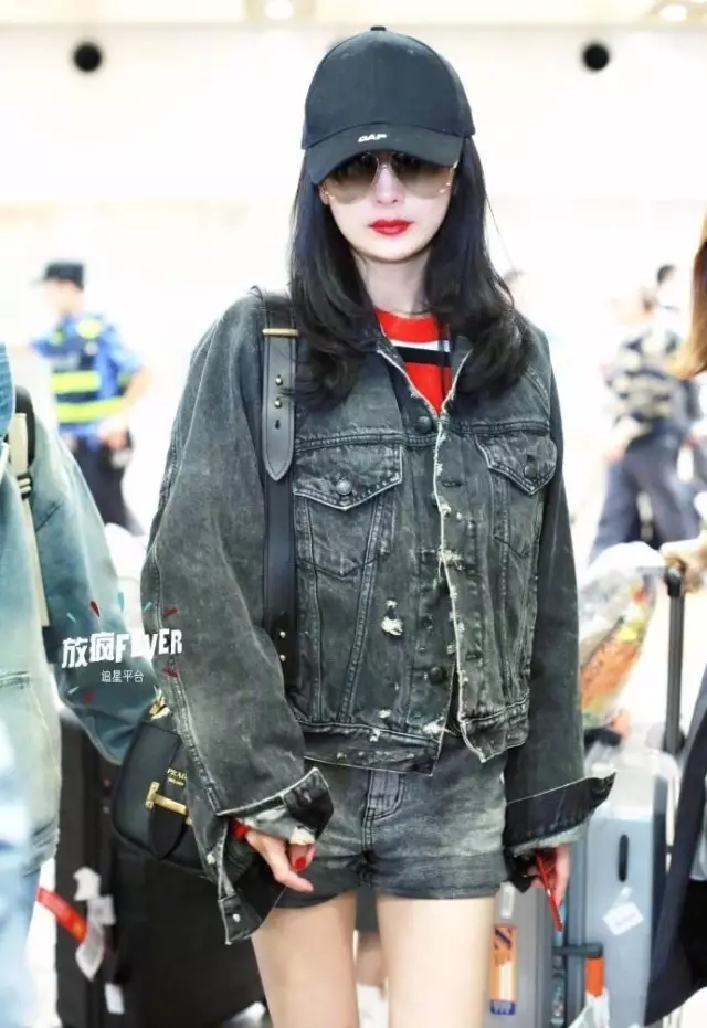 杨幂黑色做旧牛仔外套,搭配同色系牛仔短裤,脚上小白鞋和蕾丝圆点袜组合,酷劲中增加了不少俏皮和甜美。